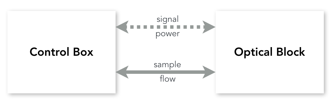 The MultiPAS consists of two primary components: (1) the optical block and (2) the control box. Both the sample and signals flow between the two components, requiring the two to be connected both hydraulically and electrically. The two components should be placed near each other on a flat, level, vibration- and sound-free surface.