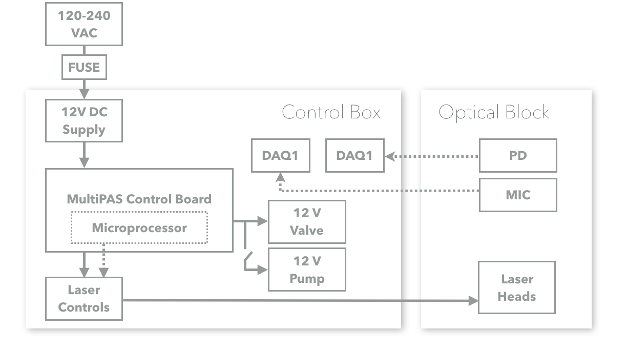 A genralized diagram of the PAS electrical system is shown below. Some components, such as photodiodes and the microphone, may require external power supplies, but the majority of the components are powered directly via the PAS control box.