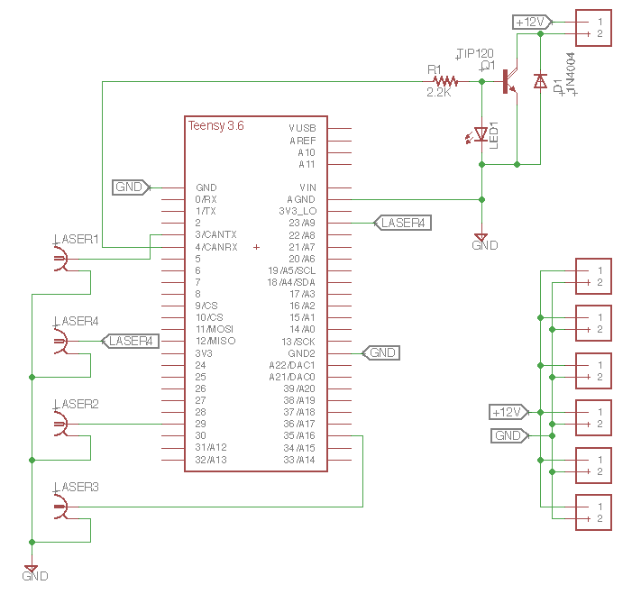 The heart of the PAS electrical system is the Teensy 3.6 (PJRC.com) microcontroller that resides on the MultiPAS control board. The Teensy communicates with the software to control the modulation of the lasers and switch the background valve on and off. The same board distributes 12 V power to the system. The MultiPAS control board may be used with both 3- and 4-wavelength versions of the PAS. Three-wavelength versions may have a Teensy 3.2 instead of the 3.6 shown on the schematic; these are, however, mostly drop-in compatible.